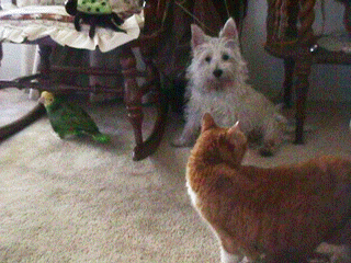 A bird, a cat... Choices, choices! What's a westie to do?!!